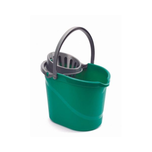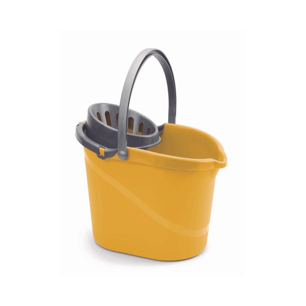 Balde de lavagem amarelo com espremedor incorporado e 14 litros de capacidade. Ideal para limpeza de pisos em áreas pequenas.
