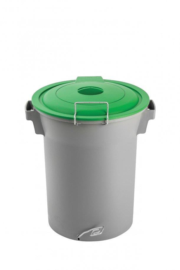 Balde cinzento redondo em polipropileno com 52 litros de capacidade, pedal metálico e tampa verde. Possui sistema de fecho metálico e pegas laterais para uma maior conveniência e facilidade na remoção e transporte dos resíduos contidos no seu interior.