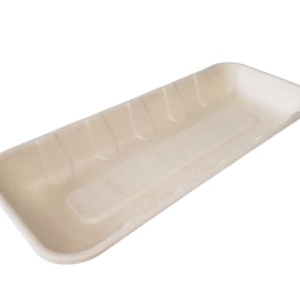 Bandeja retangular em fibra de trigo, constituída por material biodegradável, compostável e reciclável, sem qualquer componente plástico ou derivado. Temperatura máxima de uso até 120ºC, não apto para forno. Apto para micro-ondas e indústria alimentar.