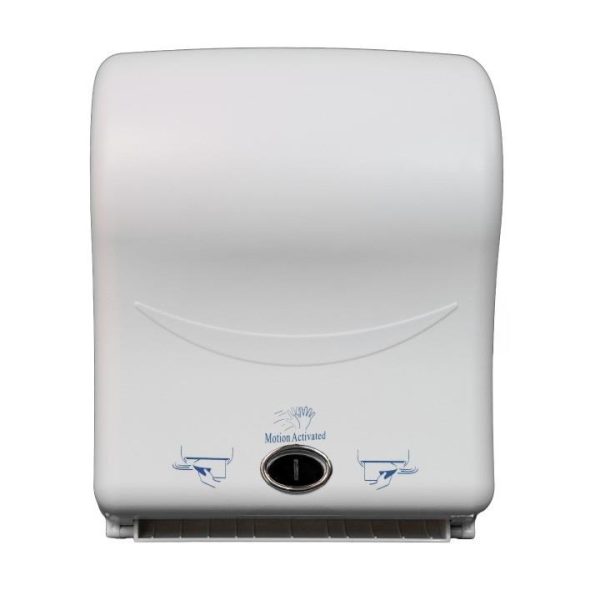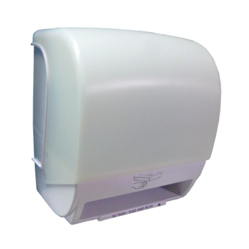 Dispensador auto cortante branco de toalhas de papel para mãos, em rolo industrial, ideal para espaços com um volume de tráfego alto. Fabricado em ABS de alta qualidade, robusto, resistente, duradouro com fácil limpeza e substituição do rolo. Proporciona serviços individuais cortados somente no momento da sua utilização. Possui janela para visualizar a quantidade remanescente de papel, com design funcional, moderno e adequado para escolas, instituições públicas e privadas, lares, centros comerciais, restaurantes e outros estabelecimentos que necessitem de critérios profissionais de higiene e limpeza.