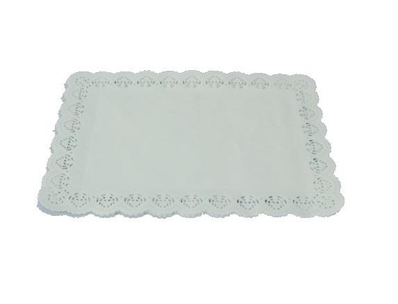 Naperon retangular de renda branco em papel de celulose pura com grande qualidade. É biodegradável, reciclável e anti gordura. Apto para a indústria alimentar.